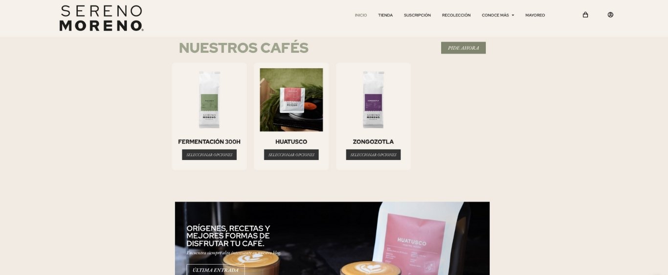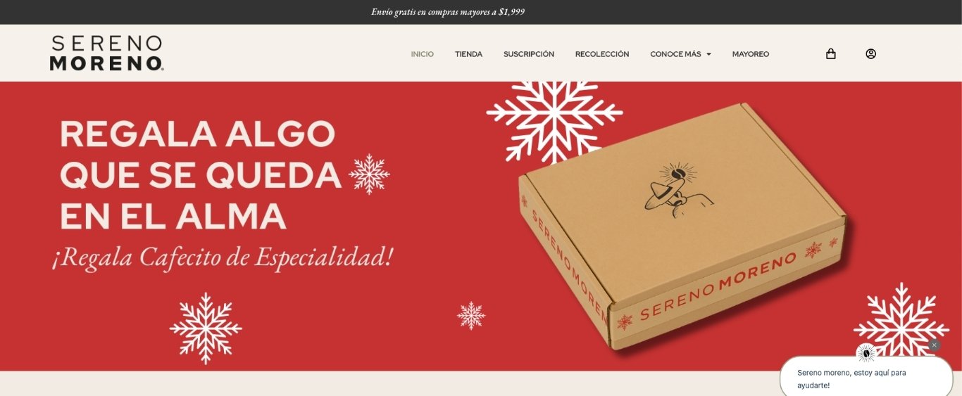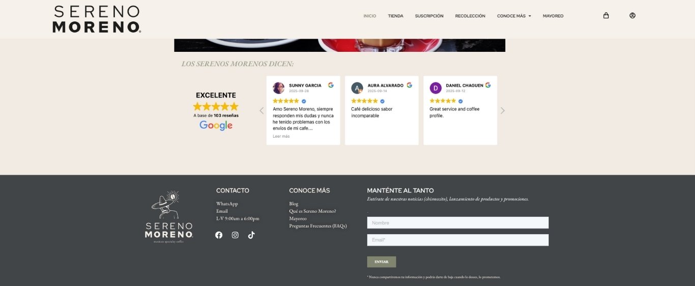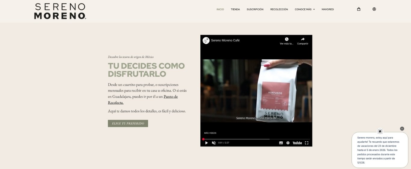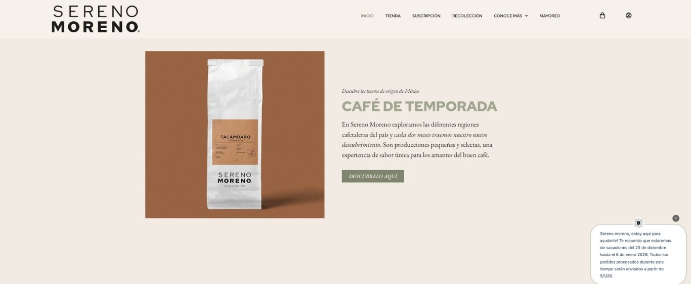 Sereno Moreno es una marca mexicana dedicada a la exploración de las distintas regiones cafetaleras del país, su propuesta brinda una experiencia de sabor única para los verdaderos amantes del café, basada en comercio justo y colaboración directa con productores. Con ellos trabajamos en la estrategia, construcción y desarrollo de su sitio web, alineando su esencia artesanal con una experiencia digital clara y funcional.